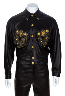 Autumn/Winter 1992-93,with a pointed collar with decorative goldtone tips, grommet, stud and bead embellishment throughout, front chest flap pockets and goldtone embossed Medusa faux button snap closure at the front and cuffs.Labeled: Gianni Versace.