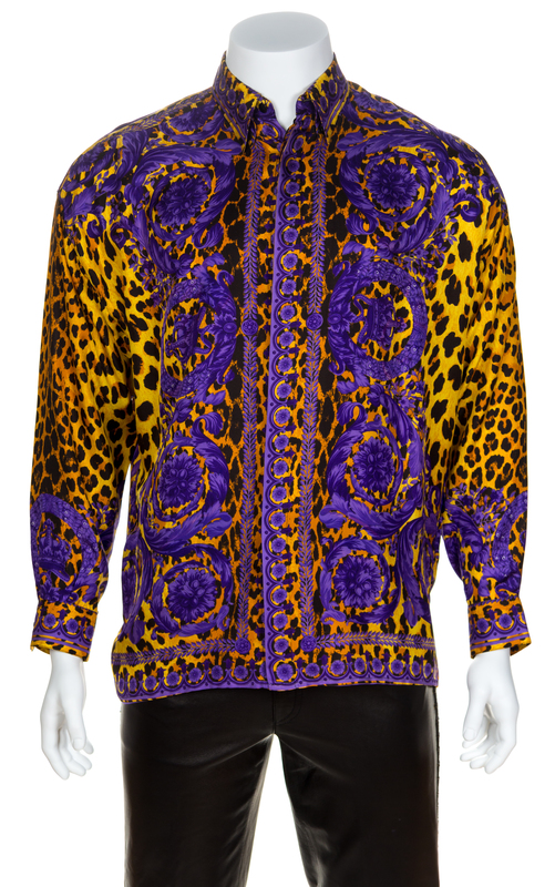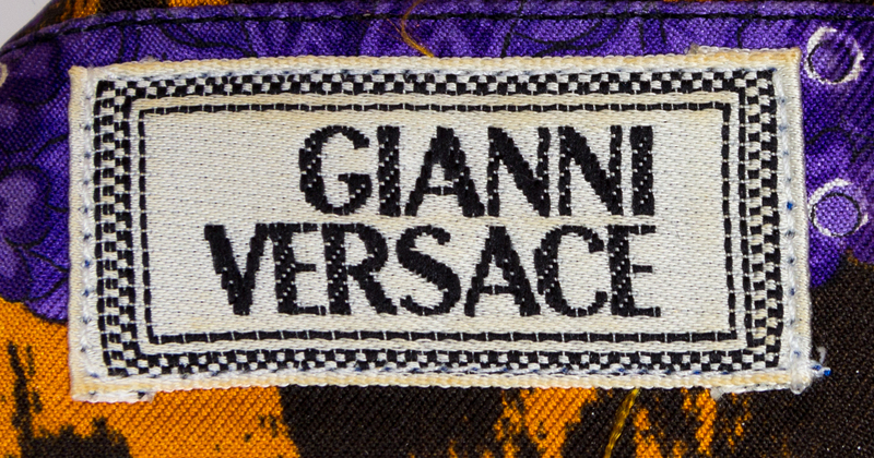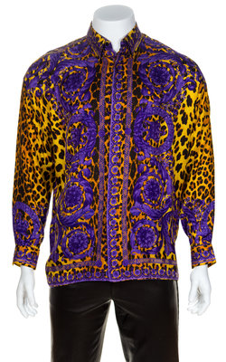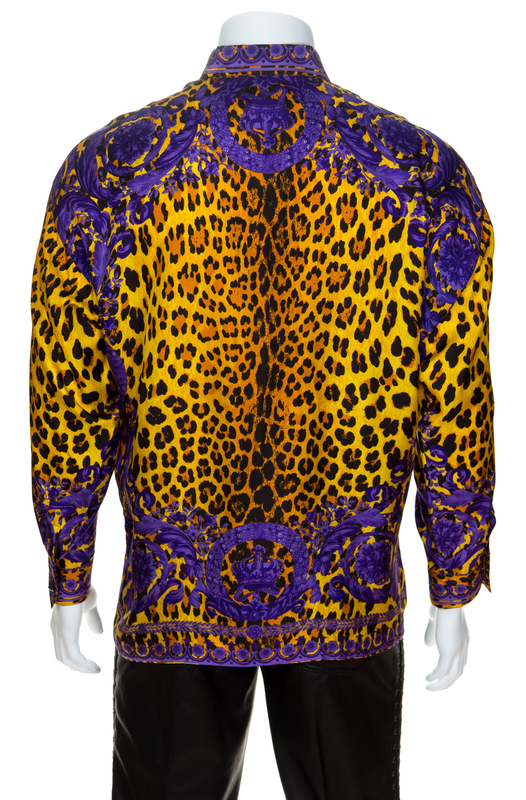 1992,with an animal and baroque print, decorative black faceted buttons at the top neck closure and cuffs and right side hidden button closure.Labeled: Gianni Versace.