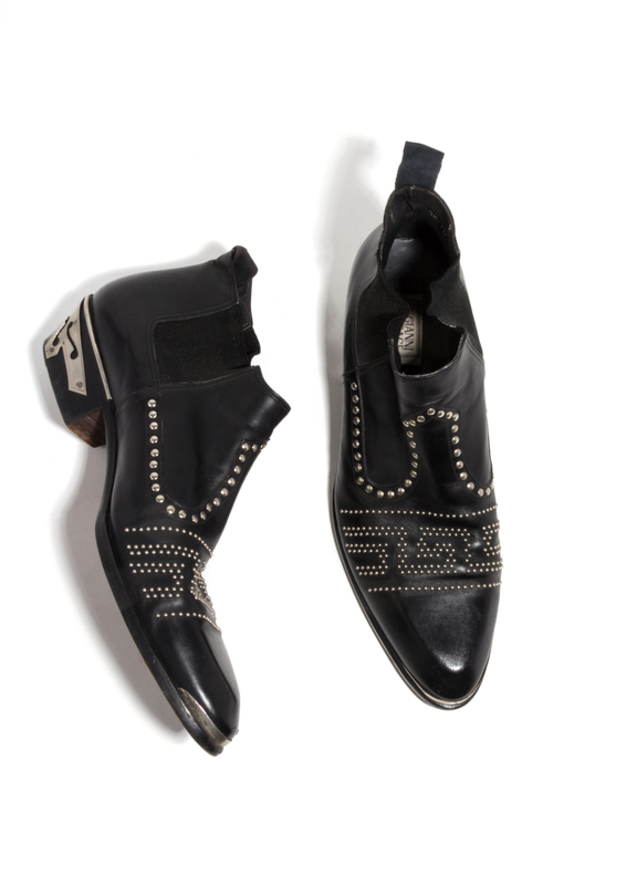 1990s,with silvertone hardware including decorative grommet detailing and a "spur" with an embossed Medusa on the heel.Stamped: Gianni Versace.