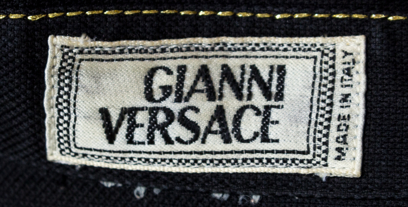 1990s,with a pointed collar, decorative gold contrast stitching, grommets and Medusa buttons, chest flap pockets and right side hidden button closure.Labeled: Gianni Versace.