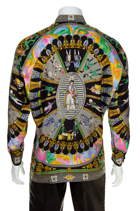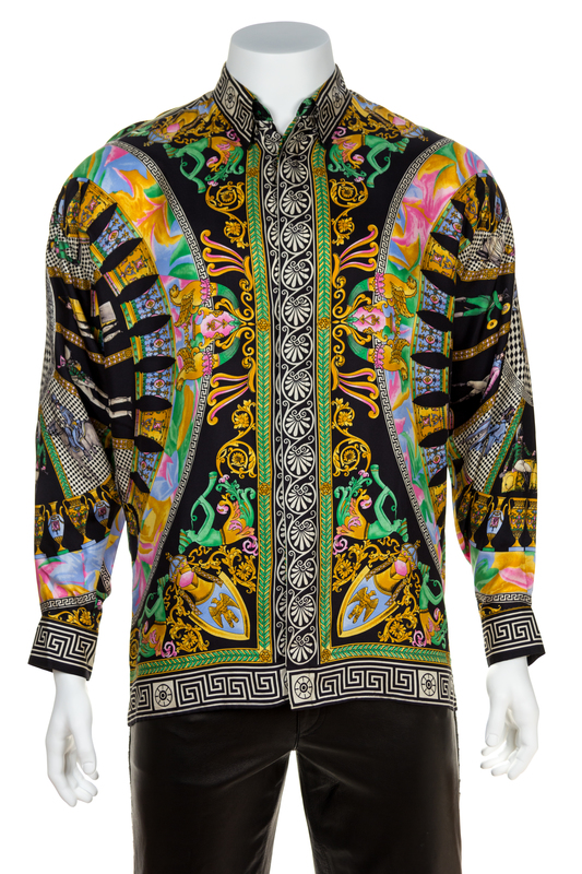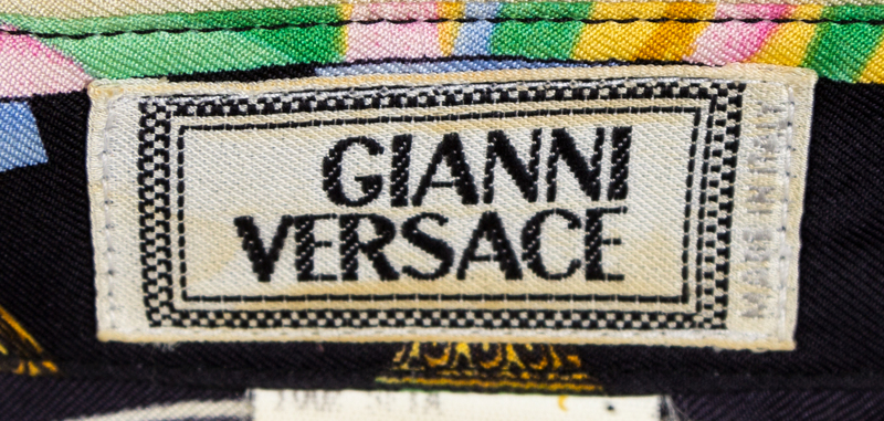 1992,with an urn print, decorative black faceted buttons at the top neck closure and cuffs and hidden right side button closure.Labeled: Gianni Versace.