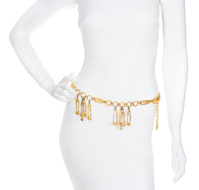 Spring/Summer 1994,goldtone with alternating round discs with hanging safety pins and greco links and an adjustable hook closure with a Medusa charm embellishment.Stamped: Gianni Versace.