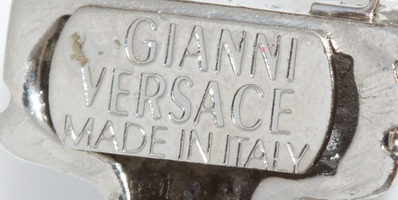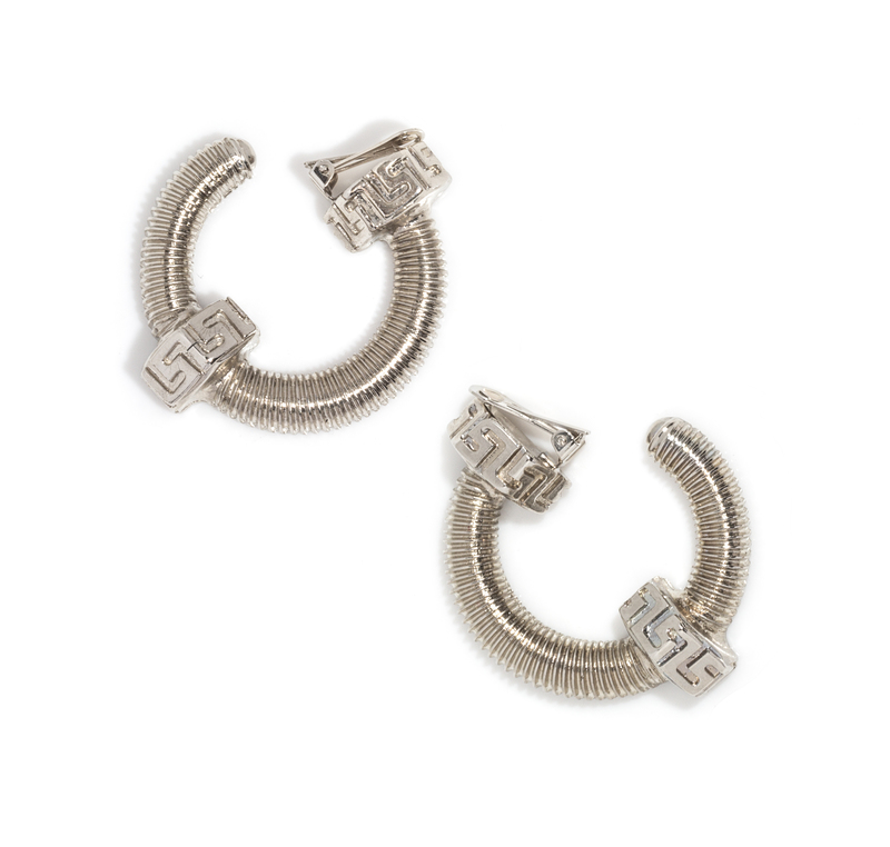 Spring/Summer 1994,silvertone with greco embossed half bolts. Pair consists of two LEFT earclips.Stamped: Gianni Versace.***LOST & DAMAGED***Communique: ci-2 LEFT earclips, not a pair.OE $300-400 now 127109/190