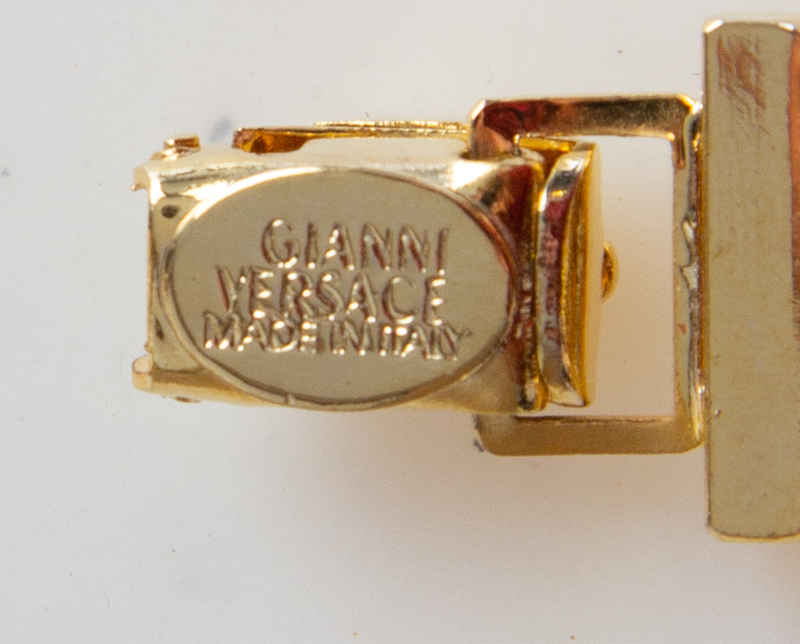 1990s,goldtone with alternating Medusa medallions and rhinestone links with a lobster claw clasp for a charm and a Medusa catch clasp closure.Together with a pouch.Stamped: Gianni Versace.