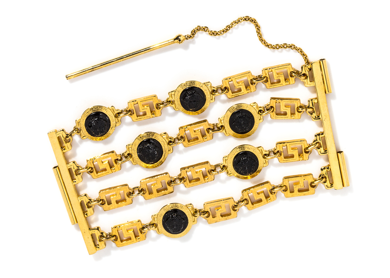 Spring/Summer 1993,goldtone with decorative black Medusa embossed medallions and a pin and barrel clasp.Unstamped and attributed to: Gianni Versace.