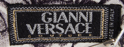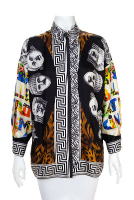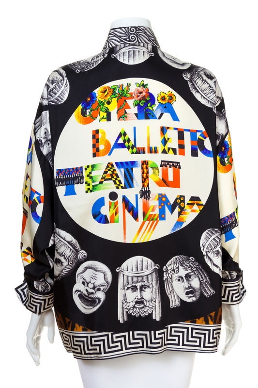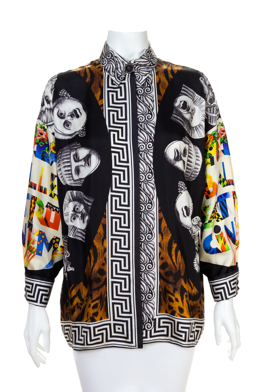 Spring/Summer 1991,"Masks" print with decorative black embossed Medusa buttons at the top neck closure and cuffs and left side hidden button closure. Design featured in the Spring 1991 ad campaign.Labeled: Gianni Versace Couture.