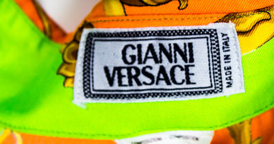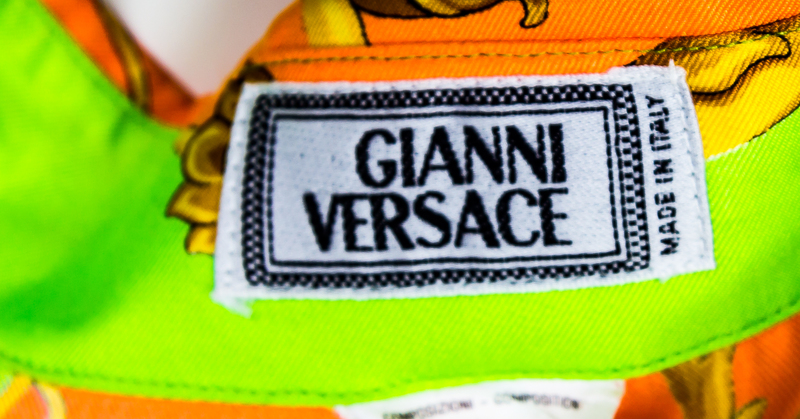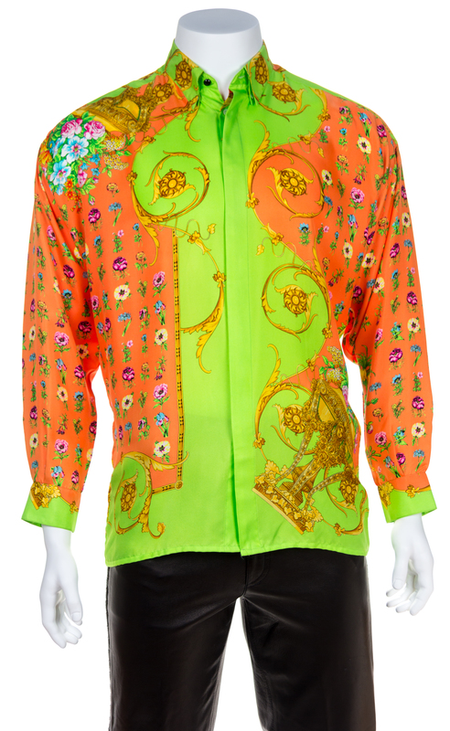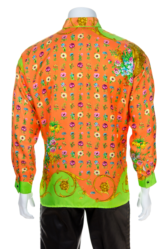 1996,floral print with decorative black faceted buttons at the top neck closure and cuffs and right side hidden button closure.Labeled: Gianni Versace.