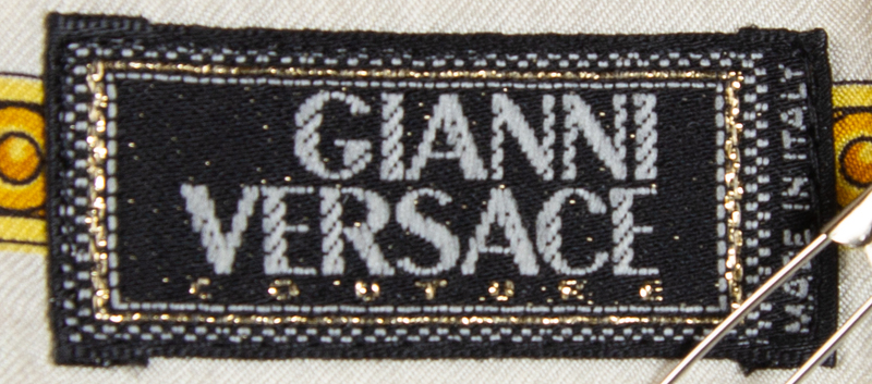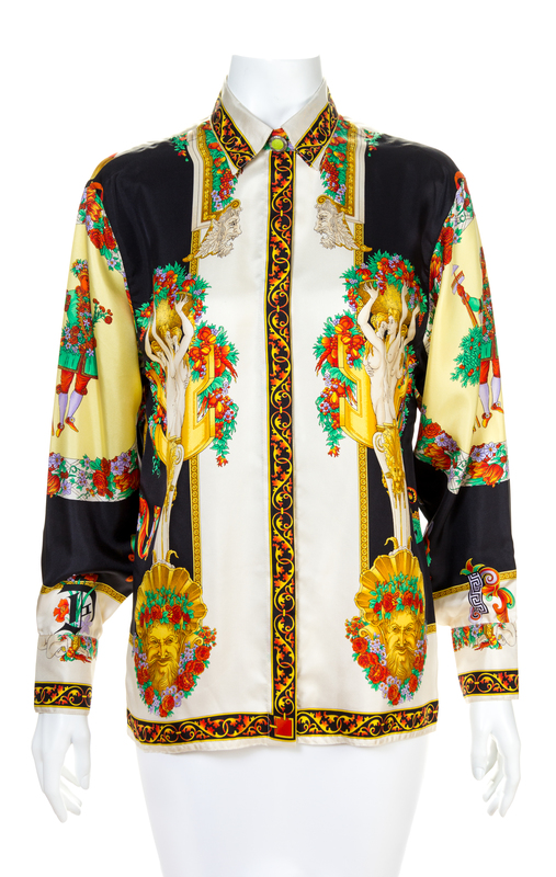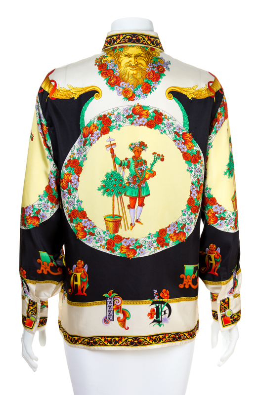 1995,"The King's Garden" print with decorative bright green embossed Medusa buttons at the top neck closure and cuffs and left side hidden button closure.Labeled: Gianni Versace Couture.