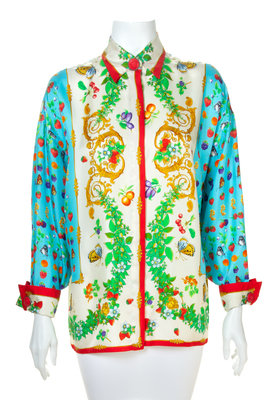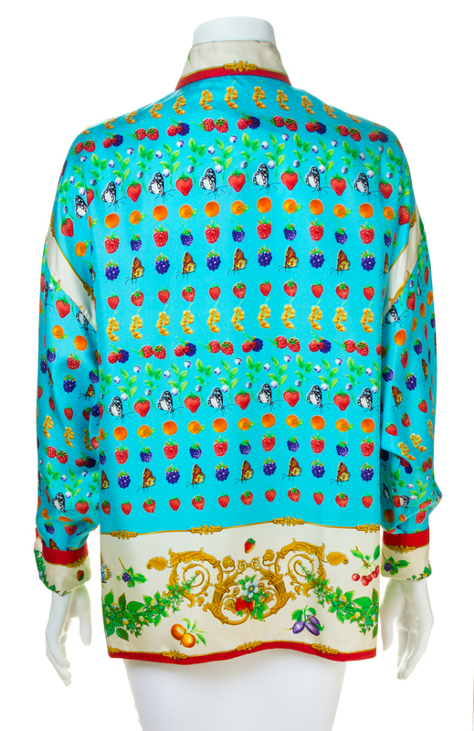 1995,with a fruit and butterfly pattern, decorative red Medusa embossed buttons at the top neck closure and cuffs and right side hidden button closure.Labeled: Gianni Versace Couture.
