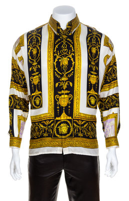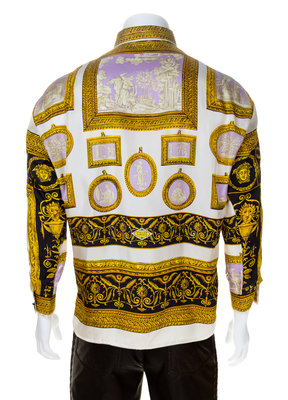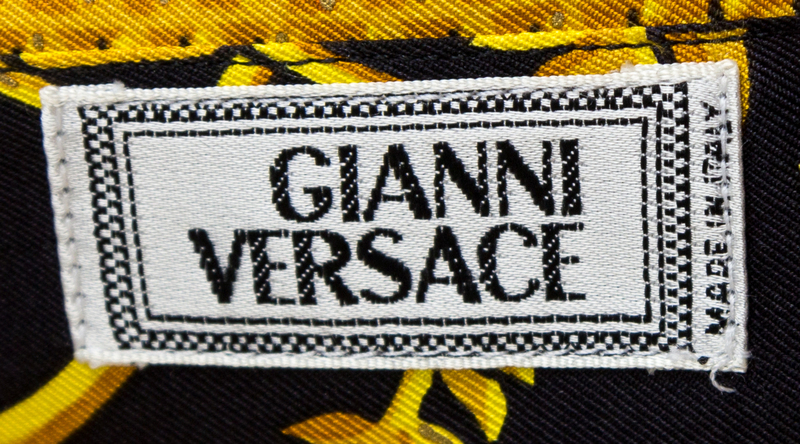 with a frame print, decorative black faceted buttons at the top neck closure and cuffs and right side hidden button closure.Labeled: Gianni Versace.