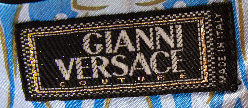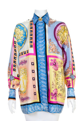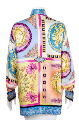 1992,with a Medusa and sun print, goldtone Medusa buttons at the top neck closure and cuffs and left side hidden button closure.Labeled: Gianni Versace Couture.