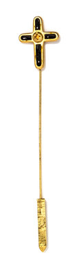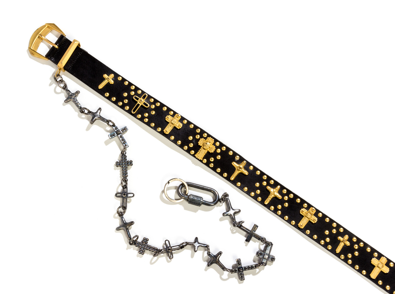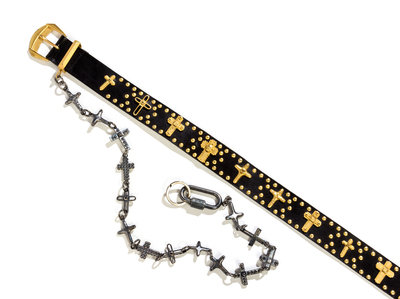1990s,with goldtone grommets and assorted decorative crosses and an attached metal cross chain with a key ring; together with a coordinating cross stick pin.Stamped: Gianni Versace.