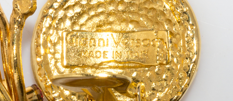 1990s,goldtone with a Medusa embossed medallion and pink rhinestone and floral embellishment. Matches the belt (Lot 145).Stamped: Gianni Versace.