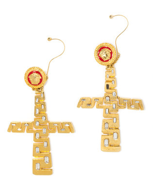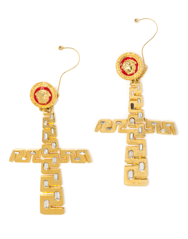 1990s, goldtone with a red Medusa medallion and a rhinestone embellished cross drop. Stamped: Gianni Versace.