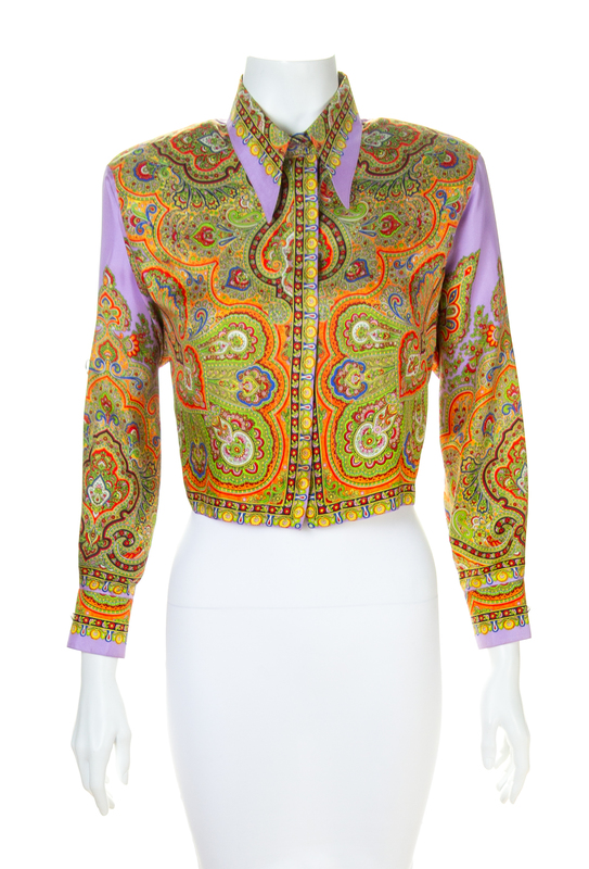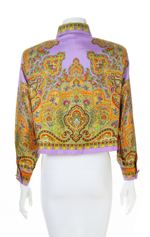1990s,with a paisley print, a pointed collar, decorative silvertone and orange Medusa embossed buttons at the cuffs and left side hidden button closure.Labeled: Gianni Versace Couture.