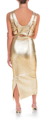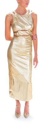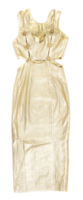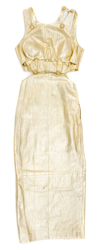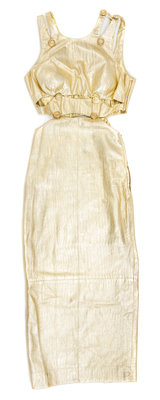 Autumn/Winter 1994-95,with Medusa gilt buttons, provocative midriff peepholes, side zip closures for the skirt and bustier, a left side back split hem and lined in gold silk..Design featured on Claudia Schiffer on the Fall 1994 Milan runway.Unlabeled and attributed to: Gianni Versace Couture.