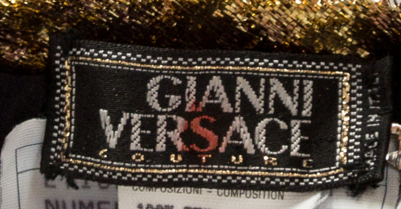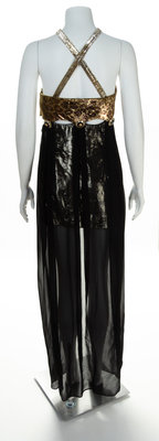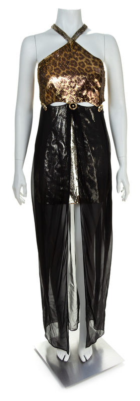Autumn/Winter 1994-1995,with a with a halter neckline with criss cross back straps, provocative midriff peepholes, a gold lame mini skirt with a sheer black silk overskirt and a side zip closure.Design featured on the Fall 1994 Milan and Paris runway (Look 76). Stamped: Gianni Versace Couture.