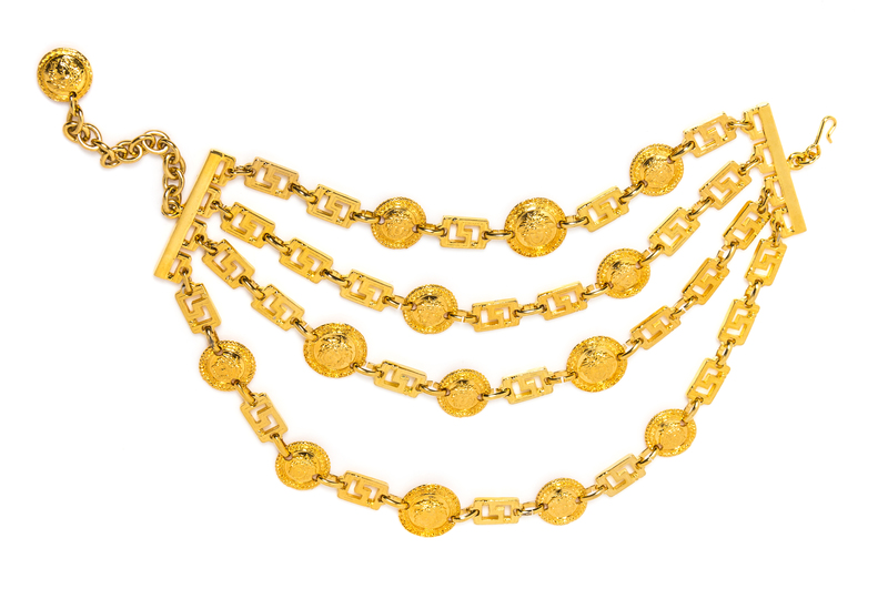 Spring/Summer 1993,goldtone with decorative Medusa embossed medallions and an adjustable hook closure.Unstamped and attributed to: Gianni Versace.