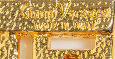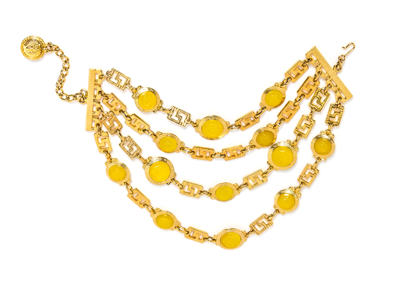 Spring/Summer 1993,goldtone with decorative yellow Medusa embossed medallions and an adjustable hook closure.Stamped: Gianni Versace.