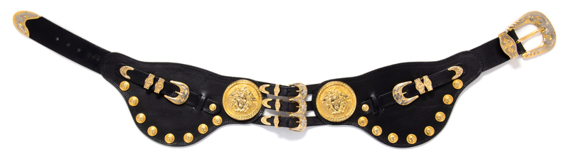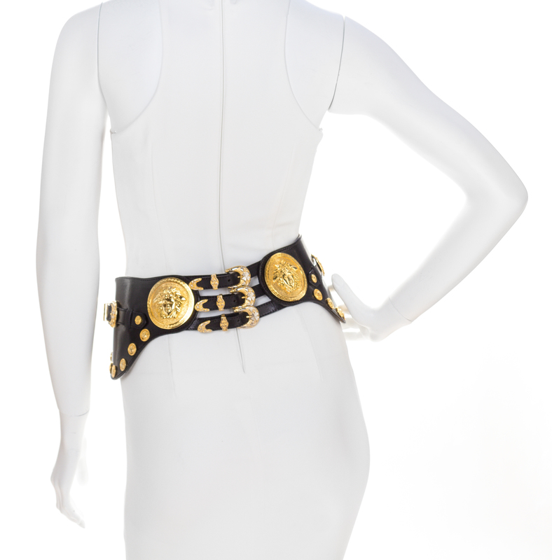 Fall/Winter 1992-1993,goldtone with decorative embossed Medusa medallions and multiple buckle detail and an adjustable belt.Design featured on the Fall 1992 Milan runway (Look 70).Stamped: Gianni Versace.