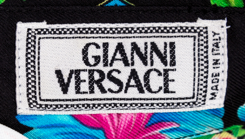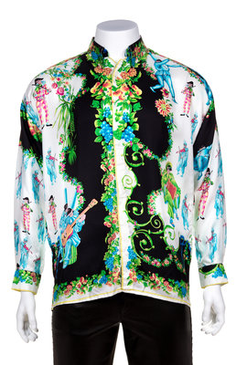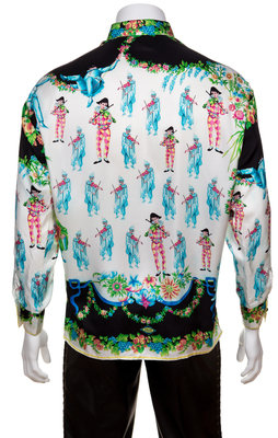 1996,with a court jester print, decorative black faceted buttons at the top neck closure and cuffs and right side hidden button closure.Labeled: Gianni Versace.