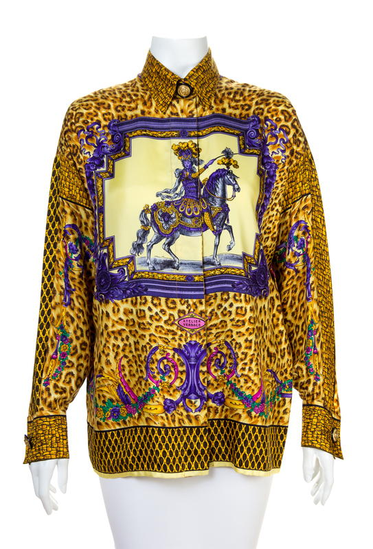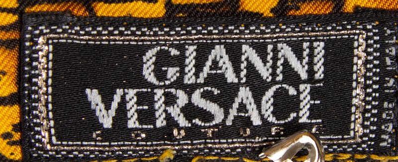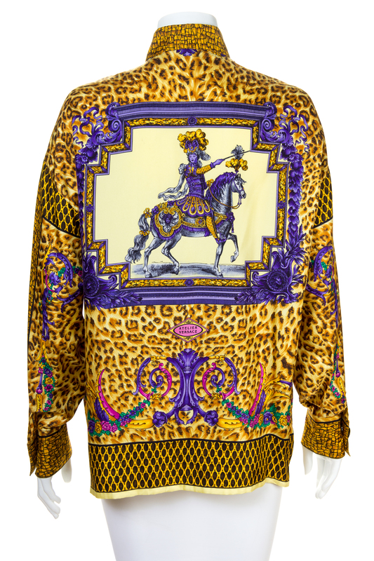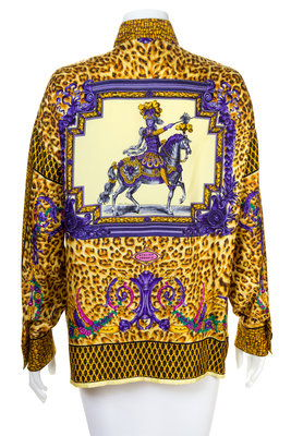 1990s,with an animal print, decorative black and goldtone embossed Medusa button closure at the top neck and cuffs and left side hidden button closure.Labeled: Gianni Versace Couture.