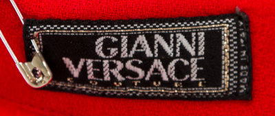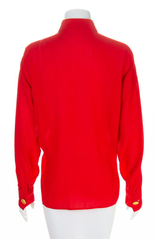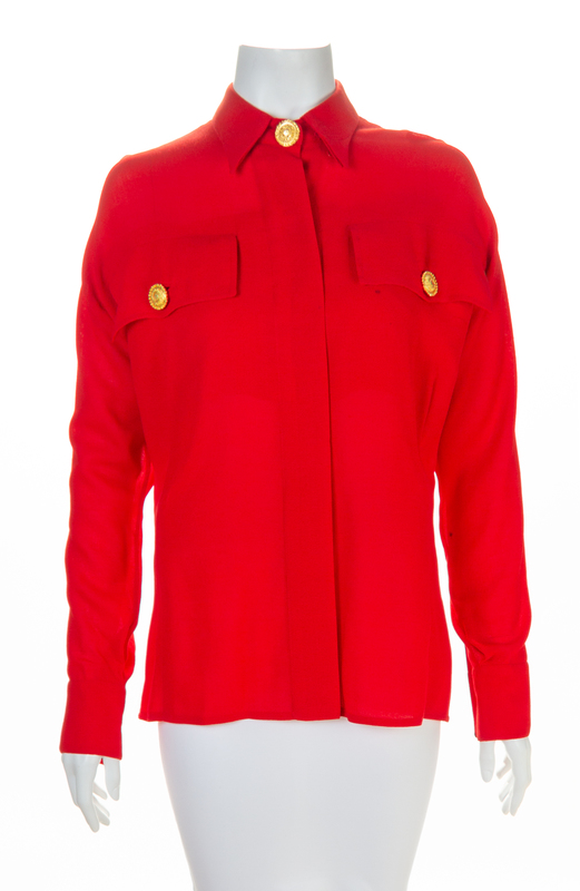 1990s,with a pointed collar, decorative goldtone embossed Medusa buttons at the chest flap pockets, cuffs and top neck closure.Labeled: Gianni Versace Couture.