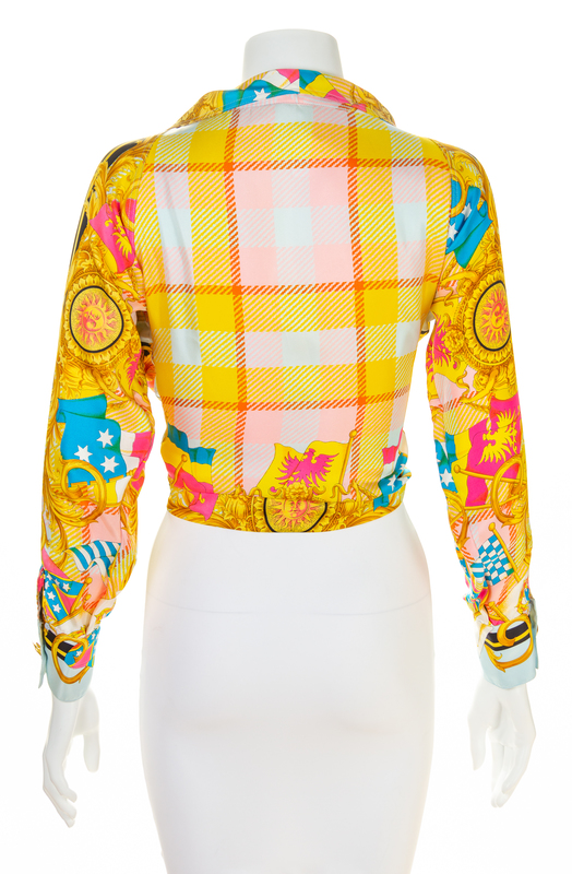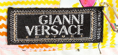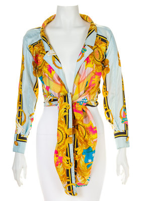 Spring/Summer 1993,"Flags" print with a notched collar, an open front with a tie closure at the waist and decorative goldtone and Medusa buttons at the cuffs.Design featured in the Spring 1993 ad campaign and Milan runway.Labeled: Gianni Versace Couture.