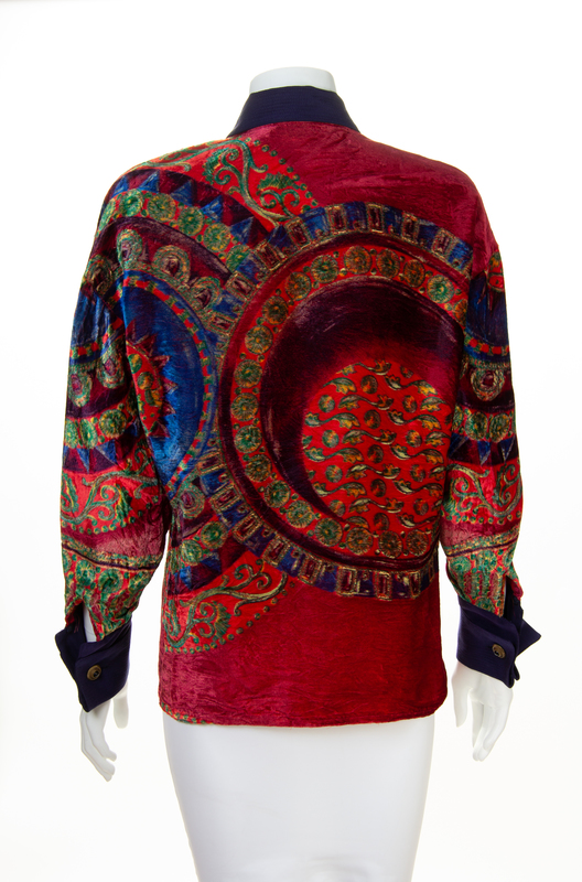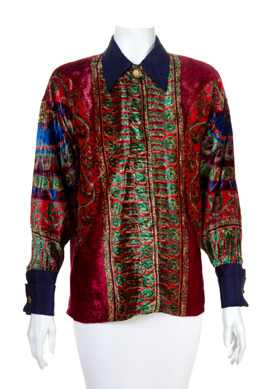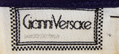 1990,with a navy topstitched collar and cuffs, decorative buttons at the top neck closure and cuffs and left side hidden button closure.Labeled: Gianni Versace.