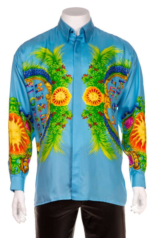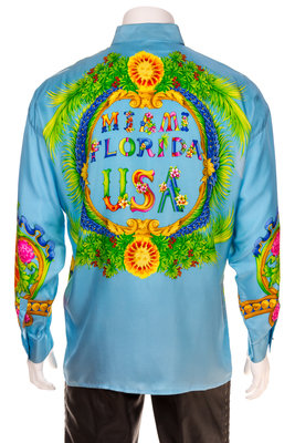 Spring/Summer 1993,"Miami" print with decorative black faceted buttons at the top neck closure and cuffs and right side hidden button closure. Design featured in the Spring 1993 ad campaign and South Beach Stories.Labeled: Gianni Versace.
