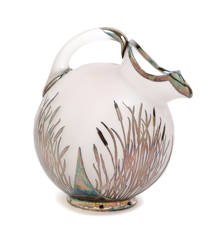 of spherical, handled form with cattail form overlays, unsigned.
