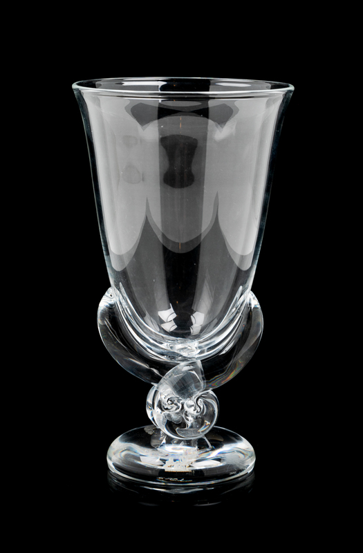 designed by George Thompson, introduced in 1942, model number 7913, of chalice form with scrolling supports, etched Steuben.