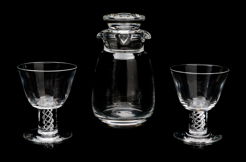 comprising a shaker, designed by George Thompson, introduced 1948, model 7961, and two stems with twist decoration, designed by George Thompson, model 7917; all in a fitted box with cloth Steuben bags.