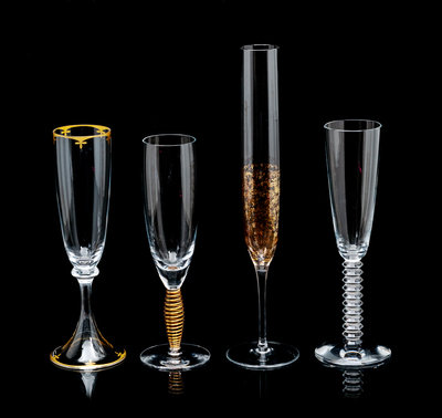 comprising a Baccarat pair, a Daum France pair with gilt decoration, a Kosta Boda pair with gilt stringing and an unmarked tall slender pair with gilt decoration.