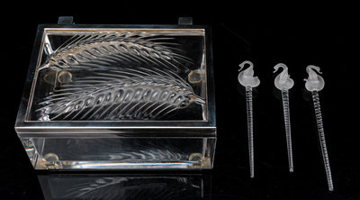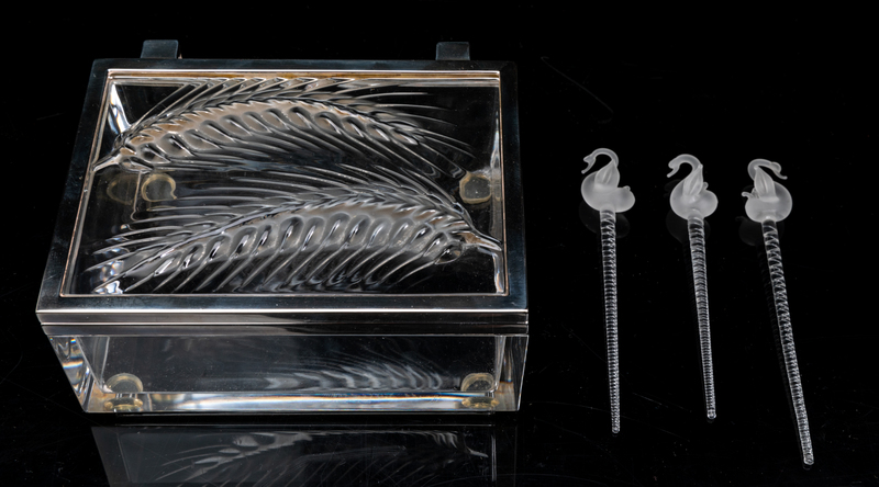 A Lalique Epis Box and Three Lalique Swizzle Sticks