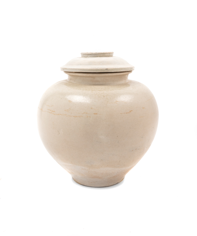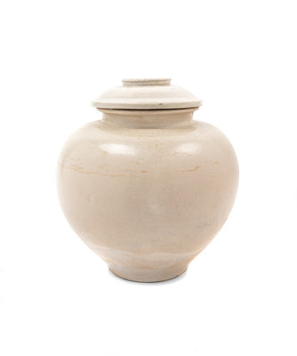 of ovoid form with a domed cover, both the interior and exterior with an ivory-colored glaze.