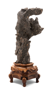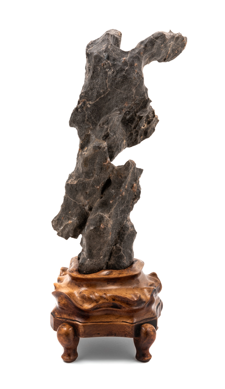 the vertical stone having a dark grey color with lighter veins, raised on a carved wood base signed J. Noakes.