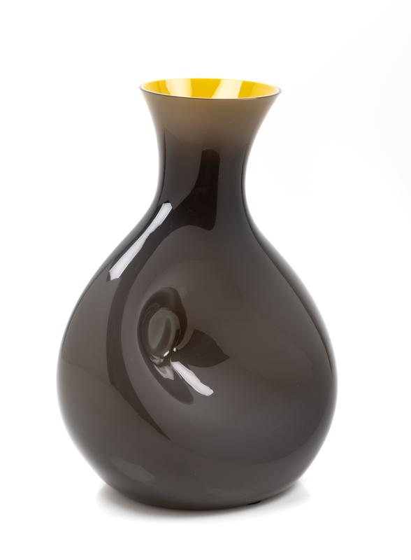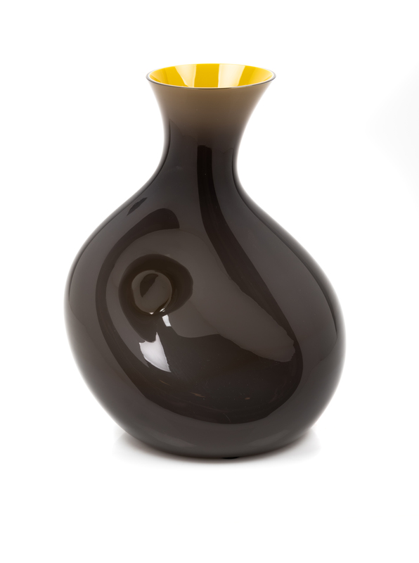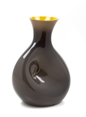 the body having a flared rim and cased in dark grey glass over mustard yellow glass.