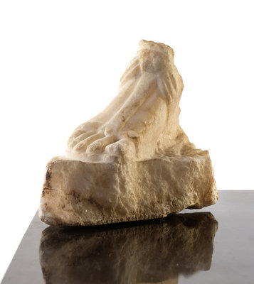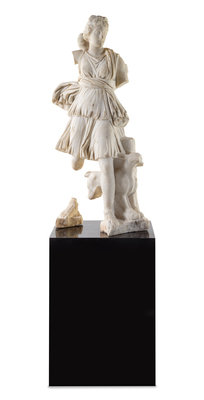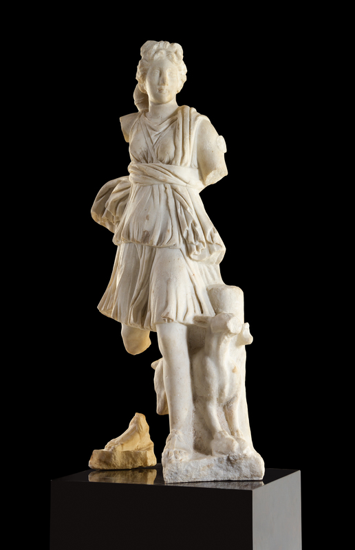 the goddess of the hunt depicted in quick motion accompanied by her hunting dog at her left side, her left leg in forward stride, shod in elaborately-laced sandals, her right extended behind, her quiver over her right shoulder, her short, sleeveless chiton with overfold, bound up in a billowing sash tied over her shoulder and around her waist, the diaphanous fabric revealing the form of her body, her gaze directed toward her left, her right arm originally raised to remove an arrow from her quiver, her now-missing left arm once holding her bow, her hair swept back from the forehead and bound in a double top-knot, preserving portions of the integral plinth.