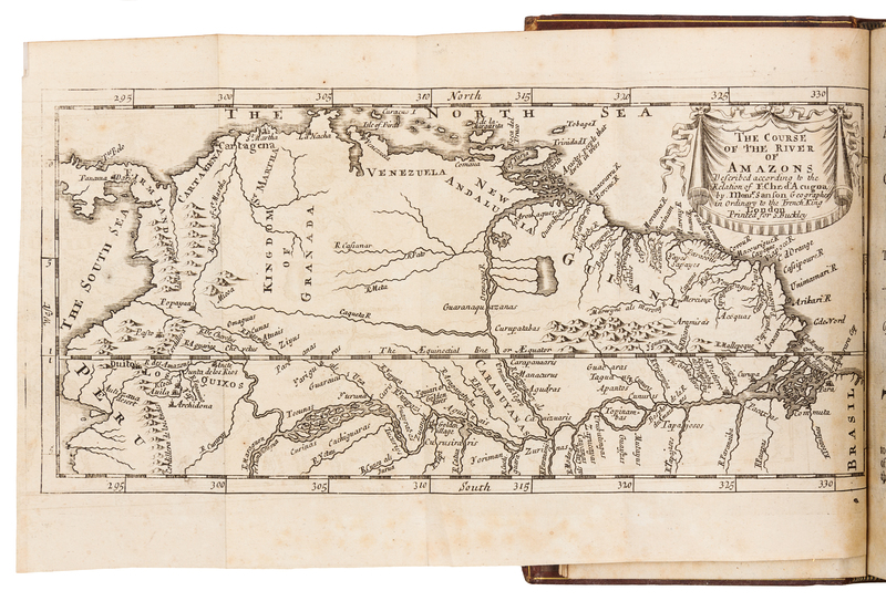 8vo (190 x 111 mm). 2 folding engraved maps; 3 title-pages. (Pale spotting.) 19th-century tan russia, panelled in gilt and blind (rebacked in tan morocco, one corner chipped). Provenance: John Hunter (bookplate); Charles W. G. Howard (bookplate). FIRST EDITION IN ENGLISH of the narratives of the first Europeans to traverse these regions. The first part comprises "Voyages and Discoveries...up the River of Amazon to Quito in Peru, and back again to Brazil by Acuna"; followed by Acarete du Biscay's "An Account of a Voyage up the River de la Plata, and thence over Land to Peru"; and concludes with "A Journal of the Travels of John Grillet and Francis Bechamel into Guiana, in the Year 1674." Parts II and III have separate title-pages. "The work of Acuna, bishop of Caracas, tells of the Spanish expedition under Pedro Teixeira which left Quito in 1639 and descended the whole course of the Amazon to Para ...This work gave for the first time scientific observations on the upper Amazon and descriptions of its Indian inhabitants" (Hill). The map by Sanson d'Abbeville is entitled "The Course of the river of Amazons" the other map depicts the "Provinces of Paraguay and Tucuman with the River Plate." Borba de Moraes I:12 ("It is a rare book"); Hill 1788; Palau 2487; Sabin 152; Wing V-746; ESTC R1215.