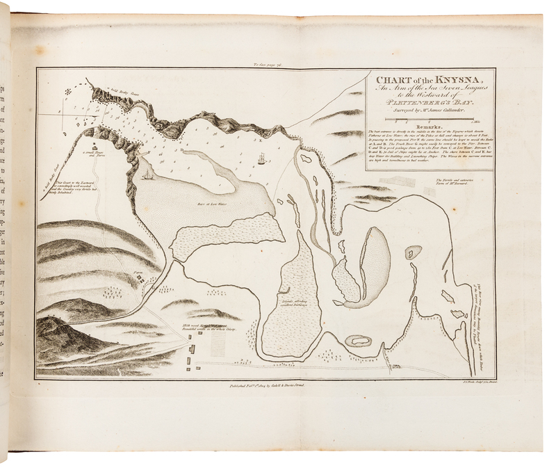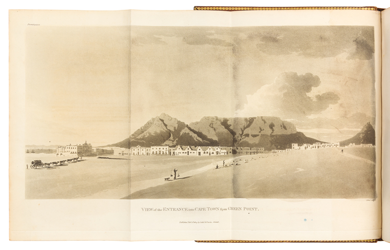 2 volumes, 4to (266 x 204 mm). Engraved folding map hand-colored in outline, folding aquatint frontispiece, 8 engraved folding maps & coastal profiles (2 with hand-coloring). (Lacking half-title to vol. I, some offsetting and spotting to text and plates.) Contemporary polished calf, marbled edges (rebacked preserving original spines). Provenance: Grantham (armorial bookplate and shelf labels). FIRST EDITION of Barrow's important account written from observations made while on the staff of Lord Macartney during the first British occupation. Barrow gives a good description of the country as seen on several journeys to Graaf-Reinet, Namaqualand and Algoa Bay, together with opinions of the inhabitants. Abbey Travel 320; Gay 2996.