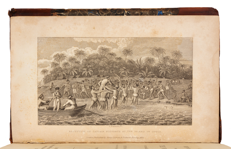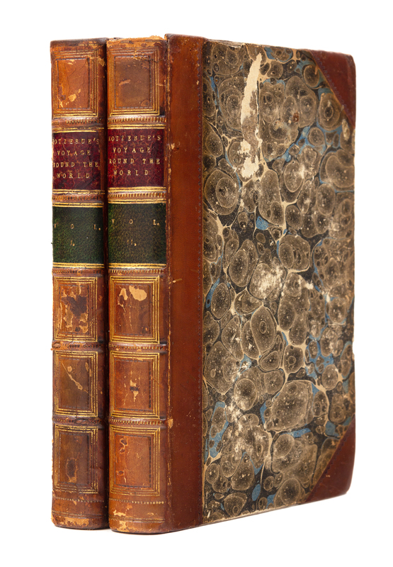 2 volumes, 12mo (190 x 119 mm). 2 engraved frontispieces, 3 engraved maps (2 folding). (Slight foxing, minor offsetting from plates and maps.) Contemporary half tan calf gilt, marbled boards (some light wear).FIRST EDITION IN ENGLISH of Kotzebue's third circumnavigation for the Czar, undertaken for the purpose of protecting Russian American Company interests on the Pacific Northwest coast against foreign fur traders. Kotzebue was an astute observer of the countries and peoples he visited, having made his first circumnavigation with Krusenstern between 1803 and 1806 (see lot 108) and commanding his second circumnavigation from 1815 through 1818 in a search of the North-West Passage (see previous lot). He provides important accounts of Alaska, especially Sitka, the new Russian settlement at Ross and the San Francisco Bay region: "Kotzebue's narrative provided reliable evidence of the potential strategic and economic value of the American Northwest, and indicated a growing Russian presence in the area which alarmed the English when his account was published in London" (Hill). Borba de Moraes I, 440; Hill 947; Kroepelien 675; see Lada-Mocarski 93 (Russian edition); Sabin 38288.