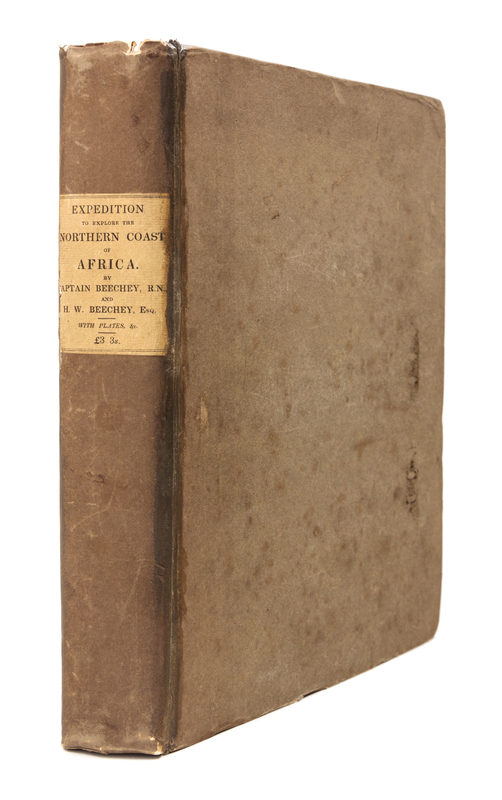 4to (290 x 215 mm). Folding map, 8 plans, 13 aquatint plates (1 folding and 2 hand-colored); errata slip, advertisements. (Very slight pale spotting, mostly marginal.) Publisher's grey boards uncut (expertly rehinged, a few chips at spine ends and to label). Provenance: Sir Joseph Radcliffe, Bart., Rudding Park (armorial bookplate).FIRST EDITION IN ORIGINAL BOARDS of Beechey's account of the Admiralty expedition by HMS Adventure under the command of Capt. W. H. Smyth, instructed to survey the coast of Libya from Tripoli to Bengazi along the Gulf of Sirte. Abbey Travel 305; Dawson, pp. 111-115.