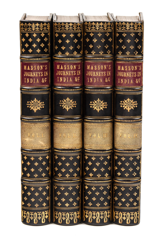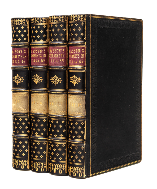 4 volumes, 8vo (217 x 129 mm). Lithographed folding map, 6 tinted lithographed plates, wood-engraved illustrations in text. (Lacking half-titles and advertisements.) Contemporary black calf gilt (neatly rebacked to style preserving original labels). Provenance: John Archibald Shaw Stewart (prize inscription from William Thomas Markham and Charles Henry Mills on his leaving Eton). FIRST EDITION recounting the author's travels from 1826 to 1838 through Balochistan, Sind, the Hazara, Afghanistan and the Punjab. He frequently travelled on foot, penniless and in disguise, and was first thought to be an American or Russian using the alias of Masson; by the 1830s, he was identified as James Lewis, a deserter from the British army as Ludhiana. He devoted his 12 years' travels to archaeological and antiquarian studies through which he gained a vast knowledge of Central Asia, which was unique among Europeans. Abbey Travel 512.