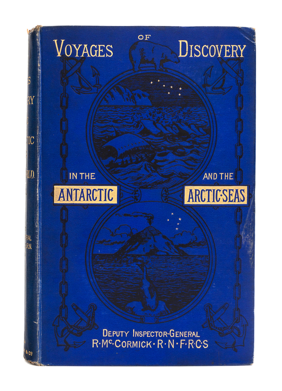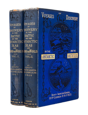 2 volumes, royal 8vo (253 x 163 mm). 63 lithographed plates including frontispiece portraits and panoramas, 3 maps (2 color-printed, one folding). 16pp. advertisements at end of vol. II. (Some light spotting on preliminary leaves.) Publisher's gilt-lettered blue cloth (a few tiny chips to spine ends, corners with very slight wear). Provenance: C. E. Collins (bookplate).FIRST EDITION of McCormick's first-hand account of the Ross expedition (1839-1843), in which he "he conveys the sense of awed wonder experienced by all aboard Ross' ships when the true enormity of the Antarctic continent revealed itself for the first time" (Taurus). He sailed with Captain Parry on his fourth voyage to the North Pole in 1827 aboard Hecla, and served under Ross from 1839-1843 on the Erebus and Terror expedition to the South Pole; he recounts both expeditions in the first volume. The second volume describes his voyage with Captain Sir Edward Belcher's 1852-54 on the last Admiralty search for Sir John Franklin and his ships Erebus and Terror (which had successfully carried Ross to the Antarctic ten years earlier). Arctic Bibliography 10582; Spence 747; Taurus 10.