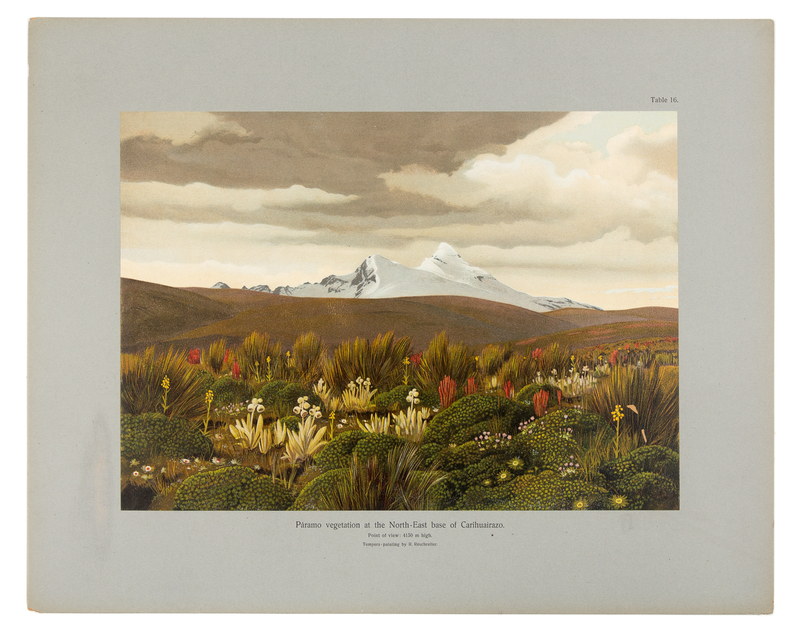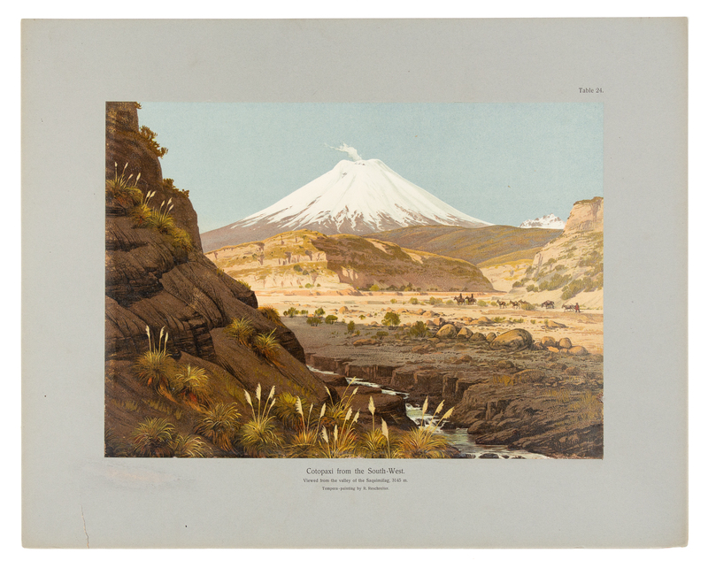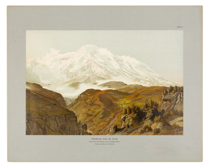 Folio (396 x 315 mm). 23 chromolithographic plates by Rudolf Reschreiter tipped to grey card (mounts 319 x 400 mm), 40 half-tone plates on 20 leaves. (2 lower corners of chromolithographed plate torn away). Loose as issued in publisher's gilt-lettered green cloth folding case (rebacked); text in modern cloth-backed card wrappers.FIRST EDITION IN ENGLISH. Meyer states in the Preface: "The collection of prints before us, together with my text volume, published in German... affords a complete description of the High Andes of Ecuador." Meyer's In den Hoch-Anden von Ecuador was first published in Berlin in 1907. RARE: according to online auction records, only one other copy of this work has appeared on the market at auction in the last 40 years. Neate M92.