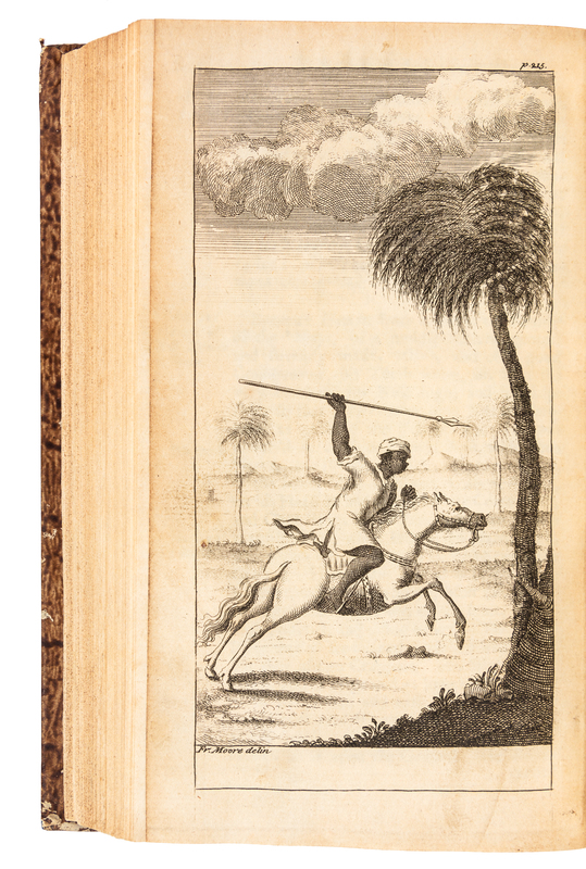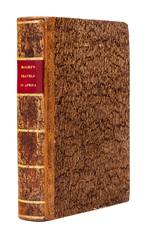 8vo (189 x 115 mm). Engraved folding map (old repairs to folds on verso, a little soiled), 11 engraved plates (one folding). (Some minor toning.) Early 19th-century continental tan quarter calf, patterned boards. FIRST EDITION of "the most comprehensive account of west African geography yet to appear in English which... remained the most authoritative source until the publication of Mungo Park's Travels in 1799 [see lot 448]" (DNB). Moore's work includes an extract from Leo Africanus's geography newly translated by Moore from the Italian (see lot 118), as well as an anonymous account of an expedition up the Gambia in 1660. ESTC T131766; Joucla, p. 180.