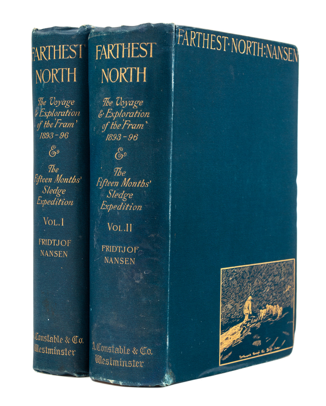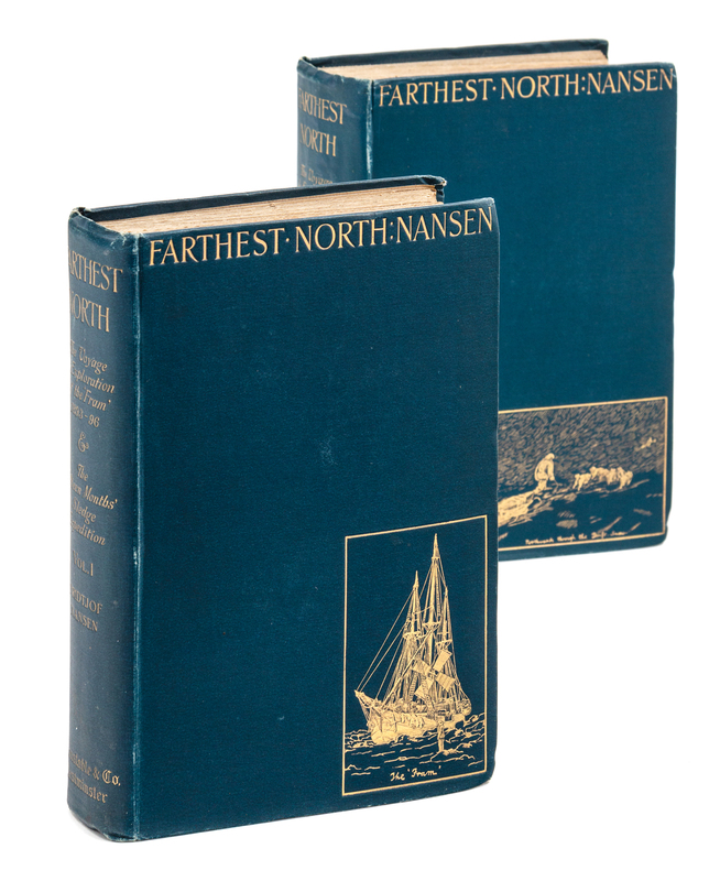 2 volumes, royal 8vo (237 x 159 mm). Etched frontispiece portrait, 4 color-printed folding maps, 16 chromolithographic plates, numerous photographic illustrations; half-titles. Advertisement for "Ice Bound" laid in. Publisher's green ribbed cloth (a touch of wear to extremities). Provenance: Arthur E. Clementson (pencil inscription, 1897).FIRST EDITION IN ENGLISH. Nansen's voyage was the first for the Fram, a ship specially designed to withstand ice pressure; after being frozen in for 3 years, the Fram emerged from the ice undamaged, and went on to carry Roald Amundsen to South Polar waters on his 1910 expedition. Though Nansen didn't reach the North Pole during his expedition, he reached the highest latitude so far attained by man (85 14'). Nansen's account was instantly successful and was translated into numerous languages. Arctic Bibliography 11983 (first American edition); PMM 353 (Norwegian edition, "it remains the classic story of Polar exploration").