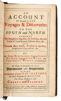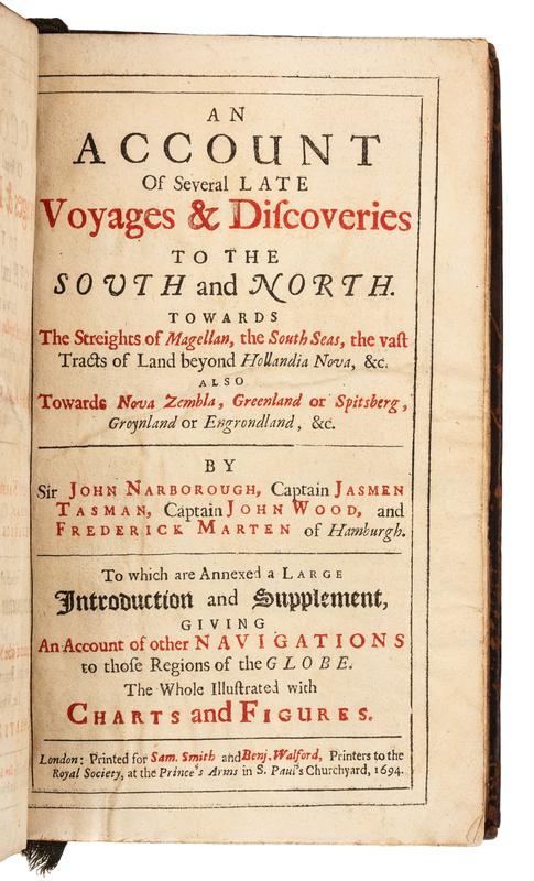 NARBROUGH, John, Sir (1640-1688), and others. An Account of Several Late Voyages & Discoveries to the South and North. Towards The Streights of Magellan, the South Seas, the vast Tracts of Land beyond Hollandia Nova, &c. Also Towards Nova Zembla, Greenland or SpitsbergTo which are Annexed a Large Introduction and Supplement giving An Account of other Navigations to those Regions of the Globe. London: for Sam. Smith and Benj. Walford, Printers to the Royal Society, 1694.