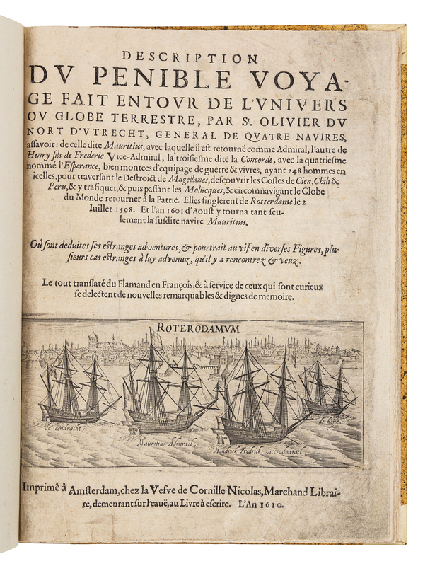 NOORT, Olivier van (1568-1611). Description du Penible Voyage fait entour de l'univers ou globe terrestre, par Sr. Olivier du Noort d'Utrecht, General de quatre navires... Le tout translat du flamand en franois, & service de ceux qui sont curieux & se delectent de nouvelles remarquables & dignes de memoire. Amsterdam: Cornille Nicolas, 1610.